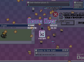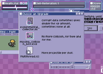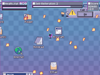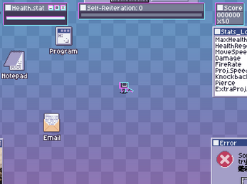 Destroy the incoming files-monsters trying to boot you out of the PC. Collect their corrupted data and create malicious code to power yourself up. Some upgrades are scripts that give you more fire power, while some are straight up standalone program that breaks how things work. The more volatile it is, the more points you get. Careful, these scripts are not immune to your destruction either. Maybe you'll be clever enough to find a way to circumvent that problem